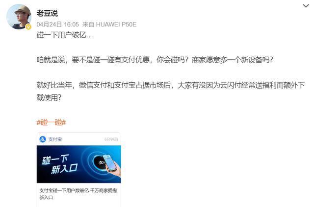 虽然目前支付宝碰一下的用户已经破亿,但是部分网友是冲着优惠而去,有网友称要不是碰一碰有支付优惠,你会碰吗?商家愿意多一个新设备吗?