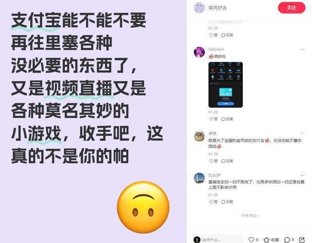 针对支付宝的直播、小游戏等功能,目前已经有网友在吐槽了,表示支付宝能不能不要再往里塞各种没必要的东西。