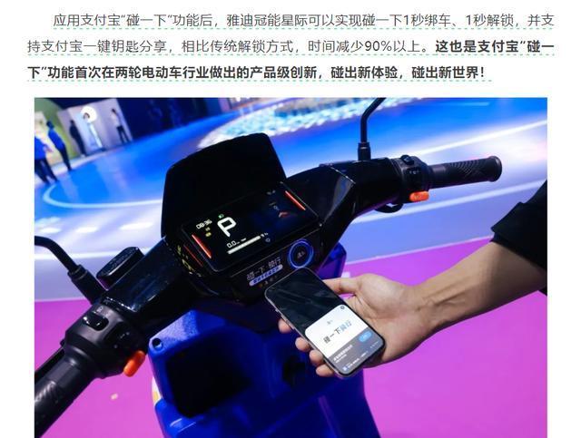 据雅迪官方介绍称,应用支付宝“碰一下”功能后,雅迪冠能星际可以实现碰一下1秒绑车、1秒解锁,并支持支付宝一键钥匙分享,相比传统解锁方式,时间减少90%以上。